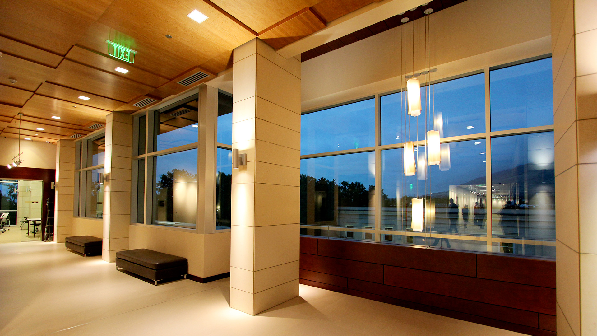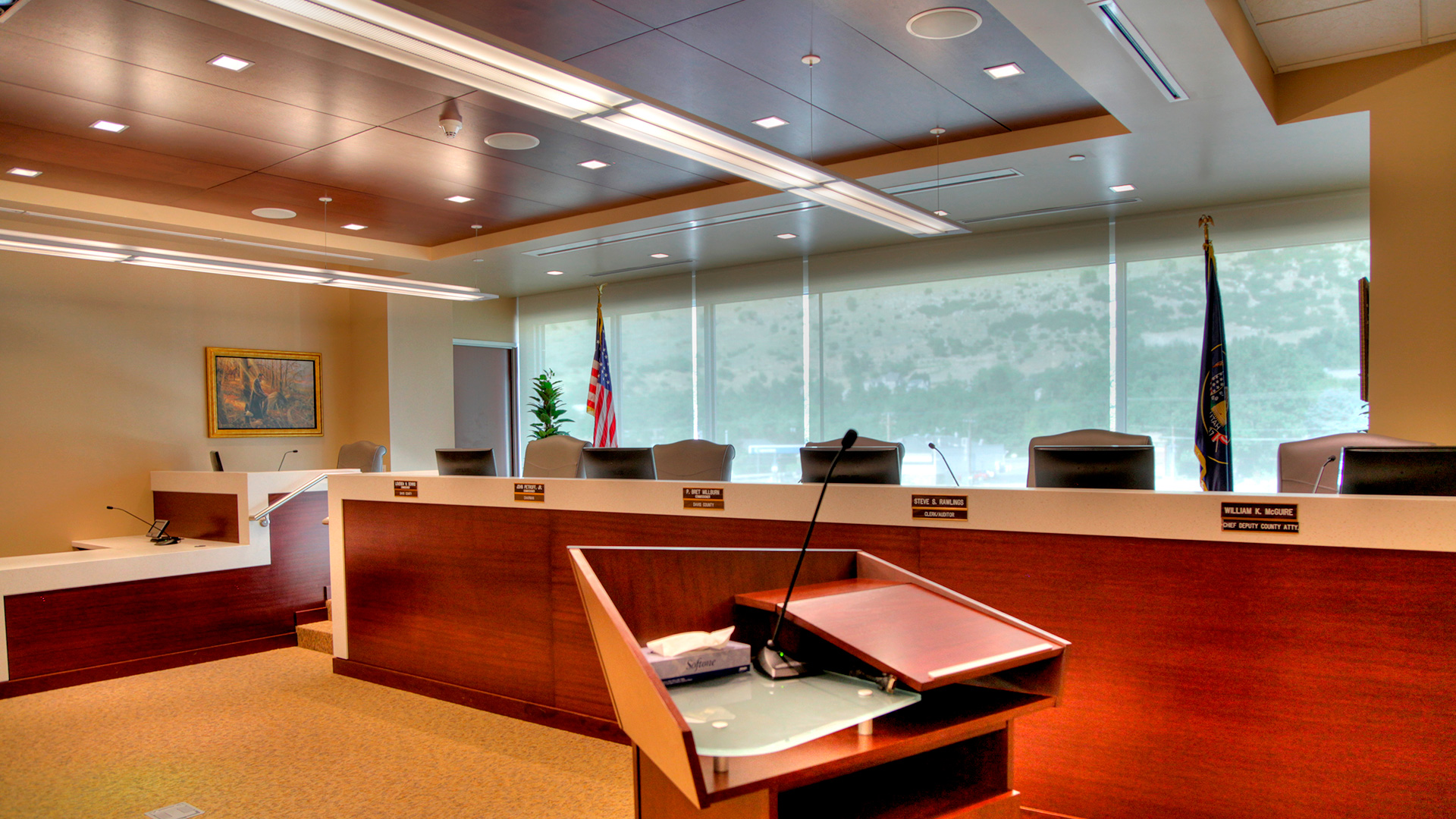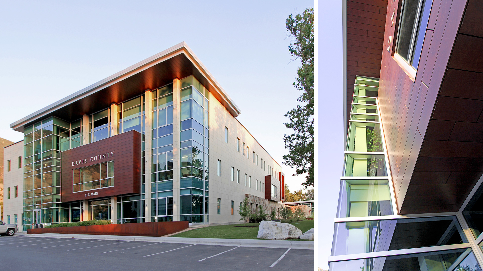 The Davis County Administration Building is part of the new complex completing the Davis County civic campus in Farmington, Utah. The three story, 73,000 total square foot building houses all departments previously located in the Farmington Courthouse, including the Clerk/Auditor, Treasurer, Information Systems, and Planning & Economic Development departments. A definitive relationship and connection between the existing courthouse and the new administration building is created through an elongated rectilinear building form and matched setback from Main Street, allowing for a continuation of pedestrian circulation and overall street character. The new Davis County Headquarters Library is physically connected at the south end of the building; an exterior “stone link” creates a seamless transition between the two occupancies. The textured rubble stone link is paired with smooth white limestone cladding, wood-veneered panels and extensive use of glass, all which work collectively to establish a strong sense of civic presence.