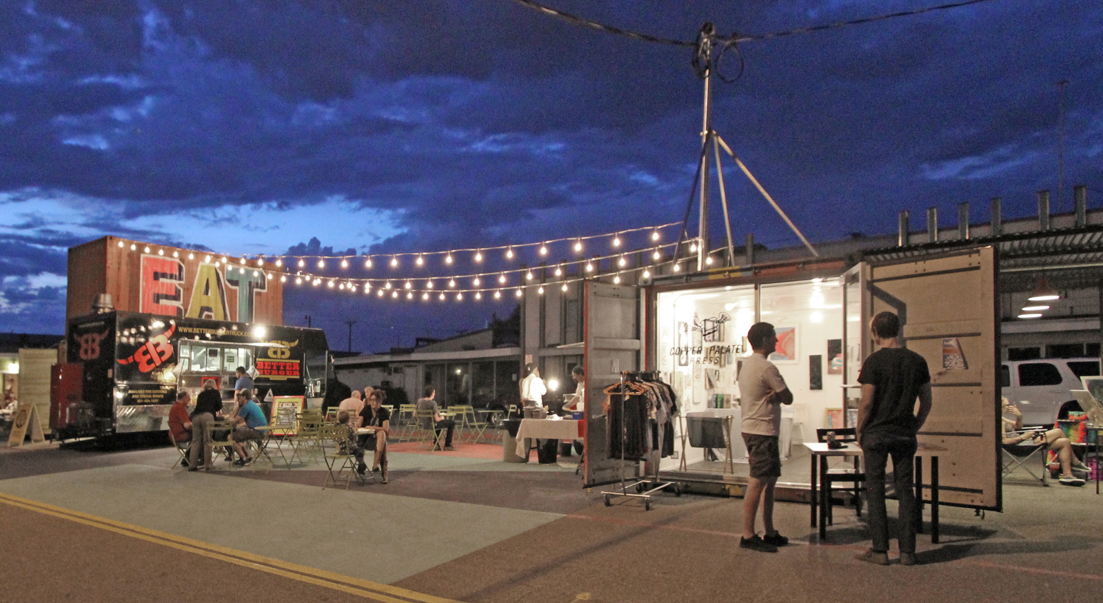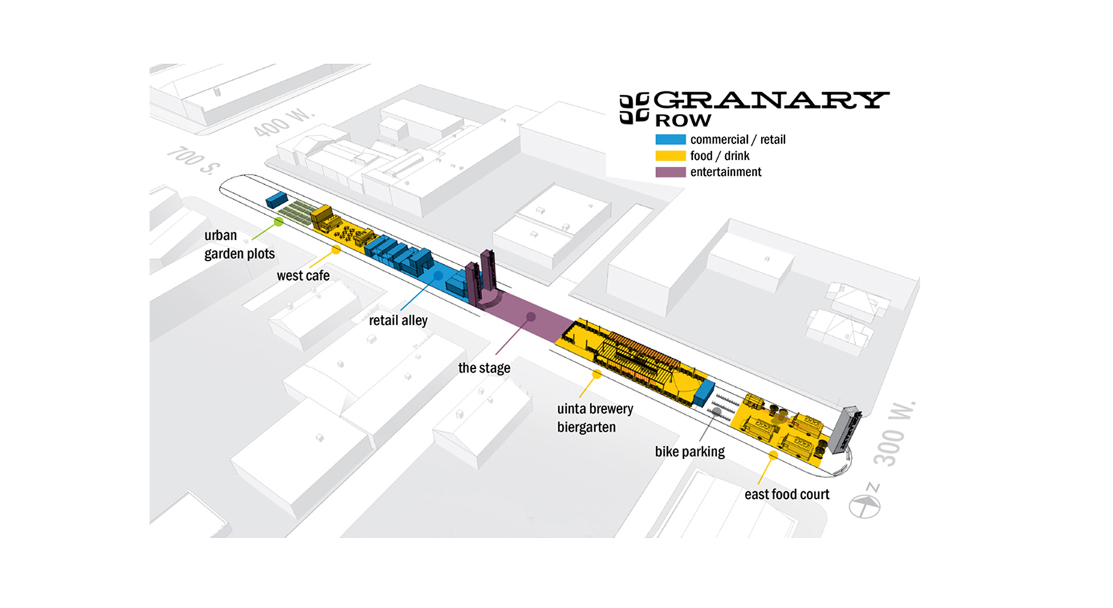 Granary Row sought to activate an entire city district by inhabiting an otherwise abandoned piece of public real estate: the center of the street. Located in Salt Lake City’s neglected Granary District, the project was the culmination of a year’s worth of study and exploration, resulting in a 5-month installation occupying the street right-of-way. Granary Row hosted concerts, food trucks, urban demonstration gardens, artists and start-up retailers looking to test the market. To create iconic signage pieces, retail shops, onsite storage and dramatic stage backdrops, shipping containers were repurposed due to their self-supporting structure and affordable nature. Local craft brewer, Uinta Brewery, operated a Beer Garden as the primary social gathering hub and anchor of Granary Row.